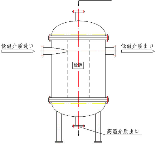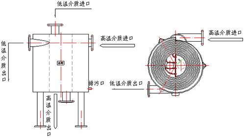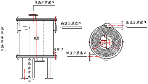 ○2可拆式Ⅱ型 可拆式Ⅱ型換熱器管內通道為閉式,介質螺旋狀運行,管外通道介質上下直通運行,主要適用于無壓力或兩個通道壓差大的場合,管內通道走壓力大、腐蝕嚴重者。這樣可節(jié)省材料且布局更趨合理性。