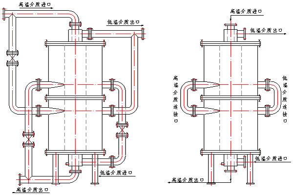 Ⅲ型簡圖 2、可拆式Ⅲ型可兩臺立式組合安裝,并聯(lián)或串聯(lián)運行(如下圖),減小安裝位置,可提高冷凝效果,加大被加熱介質使用溫度。
